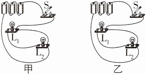 7[2024河北衡水质检,中]如图所示,当开关S闭合时,两电路中均出现短路现象。请在错接的那根导线上打“×”,并将图甲改为串联电路,图乙改为并联电路。(仅能改动一根导线)