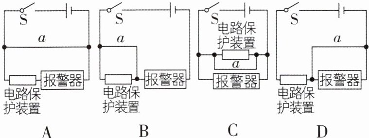5[2024辽宁大连期末,中]某新型防盗玻璃是由中间嵌有极细金属丝的多层玻璃组成的。当玻璃被击碎时,金属丝断裂,报警器就会报警。下列电路图,能满足上述要求的是(导线a为金属丝)(