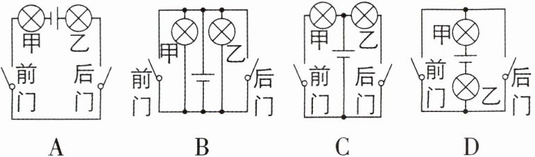 C 【解析】由题知,前门来人按下开关时甲灯亮,后门来人按下开关时乙灯亮,说明两灯互不影响、独立工作,即甲、乙两灯并联,且前门开关控制甲灯、后门开关控制乙灯,由各选项电路图可知,C正确,A、B、D错误。