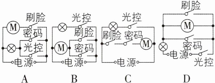 4[2025江苏南京期末,中]小明同学设计了“楼道门禁”模型。光线较暗时,光控开关闭合提供照明;通过刷脸或输入密码正确时相应开关闭合,电动机工作,门锁打开。下列电路设计符合要求的是(