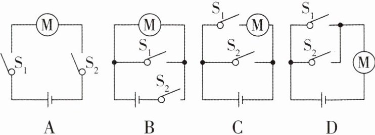 1[2023四川自贡中考,中]在富顺高铁站的自动检票闸机口,乘客需刷身份证,同时进行人脸识别,两个信息都符合后闸机门(电动机)才自动打开,检票通过。身份证和人脸识别系统都相当于开关,信息符合后开关自动闭合。下列电路中,符合上述要求的是(