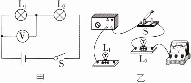 【解析】由题图甲知L₁与L₂串联,电压表测L₁两端电压,电源电压为3V,所以电压表使用小量程,连接方式如答案图所示。