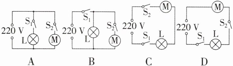 7[2024江苏无锡中考,中]电冰箱冷藏室中的照明灯L由门控开关$S_1$控制,压缩机(电动机)由温控开关$S_2$控制,要求照明灯和压缩机既能单独工作又能同时工作。下列电路中符合上述特点的是(