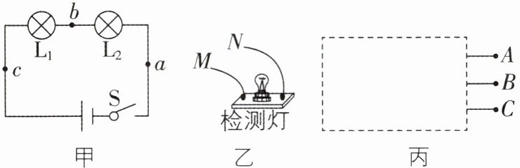 (2)另一组的小张同学,闭合开关S后,发现灯$L_1、$$L_2$仍然不亮,他用如图乙所示的检测灯探究故障,当把检测灯并联在灯$L_1$两端时,发现三个灯都不亮;当把检测灯并联在灯$L_2$两端时,发现灯$L_1$不亮,但检测灯正常发光,由此可知$L_1______,L_2______。$(均填“短路”或“断路”)