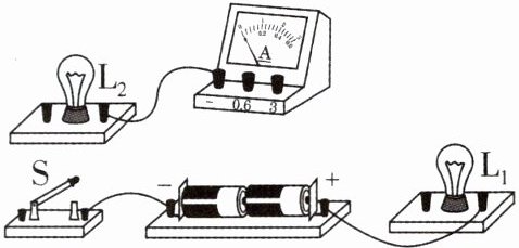 8[2024江苏常州质检,中]请用笔画线代替导线将如图所示的电路补充完整。要求:两灯并联,电流表测量通过$L_2$的电流,S只控制$L_1,$导线不能交叉,电流表接小量程。