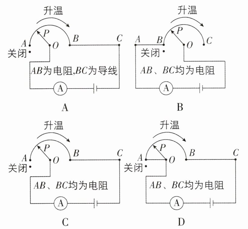 C 【解析】A 图中AB为电阻,BC为导线,当滑片滑到B点时,会造成电源短路,故A错误;B 图中AB、BC均为电阻,即定值电阻AB与变阻器串联,滑片顺时针转动时,变阻器接入电路的电阻增大,电路中电流减小,即电流表的示数减小,故B错误;C图中AB、BC均为电阻,即定值电阻BC与变阻器串联,滑片顺时针转动时,变阻器接入电路的电阻减小,电路中电流增大,电流表的示数变大,且无论怎么调节滑片都不会出现短路,当滑片OP在关闭挡时电路断开,故C正确;D图中AB、BC均为电阻,但当滑片OP在关闭挡时,OA是接通的,此时电路中仍然有电流,即不能控制电路断开,故D错误。故选C。
