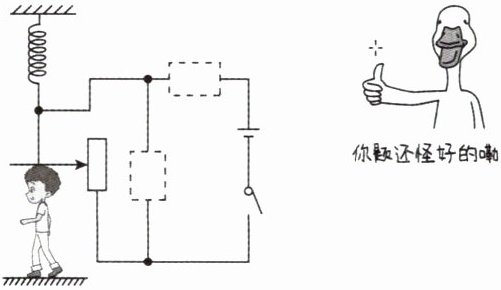 如解析图所示 【解析】电压表的内阻很大,在电路中相当于断路,所以上方虚线框内不可能是电压表;若上方虚线框内为电流表,当无人测量时,滑动变阻器的滑片位于最下方,会引起电源短路,故上方虚线框内不能是电流表,综上可知,上方虚线框内应为定值电阻,其可以在滑动变阻器滑片位于最下方时保护电路。下方虚线框内不能是电流表,否则滑动变阻器被短路,故下方虚线框内只能是电压表。