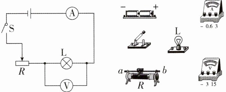 如图所示 【解析】由电路图可知,灯泡和滑动变阻器串联,电流表串联在电路中,电压表并联在灯泡两端;电压表测量范围为0~3 V,电流表测量范围为0~0.6 A;滑动变阻器的滑片置于a端时,滑动变阻器接入电路的阻值最大,所以滑动变阻器应将任一上接线柱和右下接线柱连入电路中。
