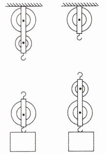 4 竖直滑轮组 [2025河南郑州二模]小李打扫卫生时需要将一个重物搬离地面,由于力气太小无法搬动,聪明的他想到了滑轮组可以省力,于是他找来家里的2个滑轮组,请你帮他选择其中一个滑轮组用来提升重物以达到最省力的目的,并画出最省力的绕线方式(两幅图都画不得分,绳子需要绕过每一个滑轮,每个滑轮只能绕绳一次,忽略动滑轮重力)。