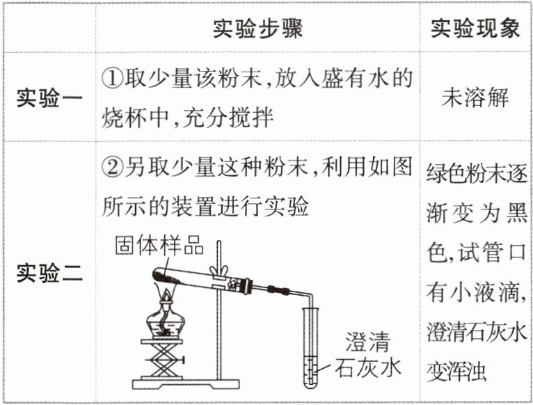 (3)由题述两个实验可知,碱式碳酸铜是绿色粉末,不溶于水,这属于物理性质;碱式碳酸铜受热易分解,这属于化学性质。
