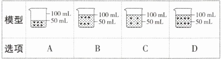 4建立模型是解决问题的一种方法。如图所示烧杯中盛放的是50mL10%的蔗糖溶液,其中“·”表示蔗糖分子。在该溶液中加入一定量的水,使其变为5%的蔗糖溶液。下列能表示稀释后蔗糖溶液模型的是 (