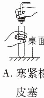 A 【解析】用带玻璃管的橡皮塞塞住试管时,一手持试管,一手持橡皮塞,稍稍用力转动橡皮塞,使之塞入试管中,切不可把试管放在桌上再使劲塞进塞子,以免试管破裂,A操作错误。