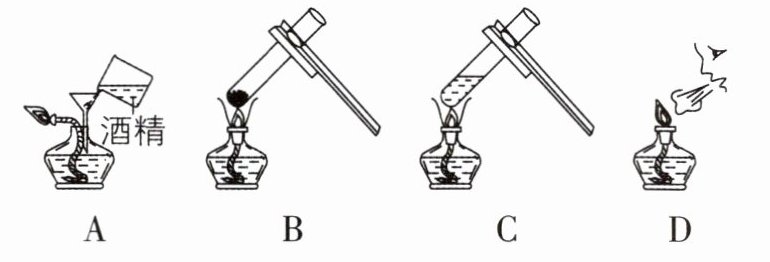 C 【解析】使用酒精灯时,禁止向燃着的酒精灯内添加酒精,A错误;给试管中的固体试剂加热时,试管口应略向下倾斜,B错误;给试管中的液体加热时,应用外焰加热,液体体积不能超过试管容积的三分之一,C正确;熄灭酒精灯要用灯帽盖灭,不能用嘴吹灭,D错误。