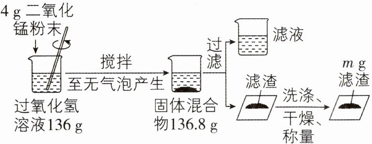(1)过氧化氢制取氧气的反应中,二氧化锰为催化剂,反应前后质量不变,则m = 4;根据反应前后物质的总质量不变可知,生成氧气的质量为136g + 4g - 136.8g = 3.2g。