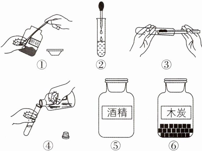 5. B 【解析】取用药品时,瓶塞应倒放在桌面上,①操作不正确;用胶头滴管滴加液体时,应竖直悬空在试管口上方滴加,②操作不正确;取用粉末状药品时,试管倾斜,用纸槽或药匙将药品送至试管底部,然后将试管直立,③操作正确;取用液体药品时,瓶塞倒放在桌面上,标签朝向手心,试管倾斜,试剂瓶瓶口紧挨试管口,④操作正确;酒精为液体药品,应存放在细口瓶中,⑤操作不正确;木炭为固体药品,应存放在广口瓶中,⑥操作正确。故选B。