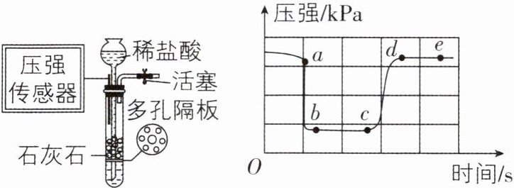 C 【解析】a点对应操作是打开活塞,气体逸出,试管内压强迅速减小,A正确;bc段压强较小且稳定,此时石灰石与稀盐酸反应生成二氧化碳气体,生成的二氧化碳气体持续逸出,此时可在导管口处收集气体,B正确;cd段试管中压强增大,是因为关闭了活塞,试管内压强增大,试管内气体将液体压入长颈漏斗内,试管内液面逐渐下降,C错误;de段压强不再发生变化,说明反应停止,固体与液体脱离接触,D正确。