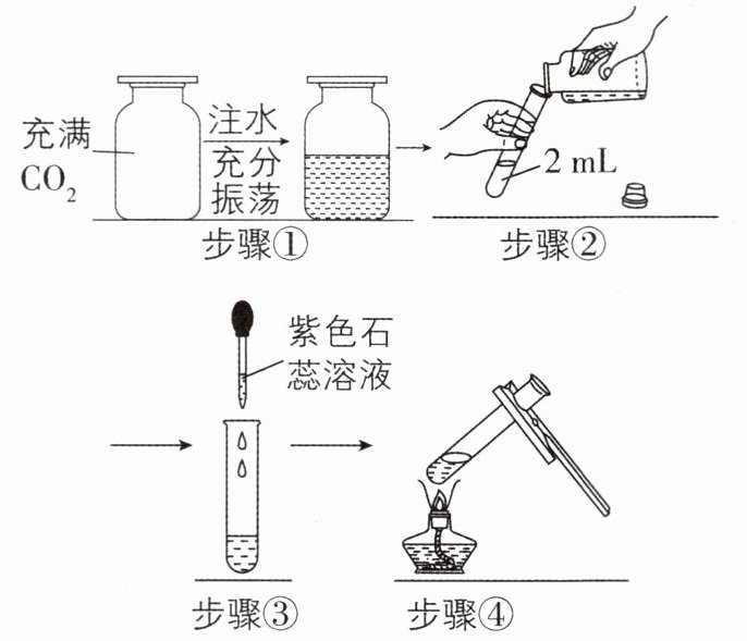 C 【解析】步骤①向充满二氧化碳的集气瓶中注水,充分振荡,由于二氧化碳能溶于水且能与水反应,则瓶内气体减少,气压变小,A正确。二氧化碳和水反应生成的碳酸能使紫色石蕊溶液变红,B正确。碳酸不稳定,受热会分解为二氧化碳和水,故加热后,溶液会重新变为紫色,C错误。步骤③通过向溶液中滴加紫色石蕊溶液观察颜色变化,可以得出二氧化碳和水反应生成了碳酸,步骤④可以验证生成的碳酸是不稳定的,它会在加热时分解,D正确。
