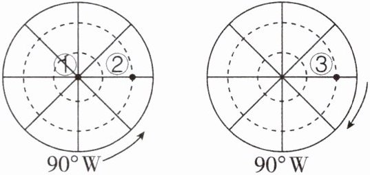 1.B 【解析】地球自转的方向是自西向东,读图可知,左图中地球自转的方向是逆时针,右图中地球自转的方向是顺时针,由此判断左图是在北极上空看地球自转,故图中①点的纬度是$90^{\circ}\text{N}$。故选 B。2.D 【解析】读图可知,②地经度为$0^{\circ}$,③地经度为$180^{\circ}$,②地和③地时间相差 12 小时,当②地雄鸡报晓时,③地可能的活动是在家吃晚饭。故选 D。3.B 【解析】读图可知,②③两地位于不同经线上,时间不同,A 错误;②③两地位于同一经线圈上,B 正确;③地位于$180^{\circ}$经线上,②地位于本初子午线上,C 错误;②地位于东半球,③地位于西半球,D 错误。故选 B。