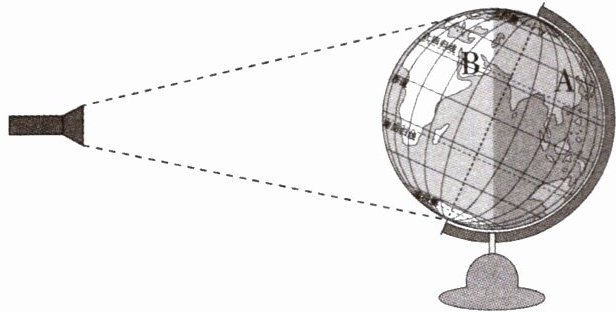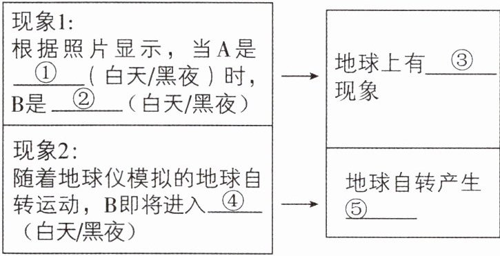 (2)读图可知,当 A 是黑夜时,B 是白天,这说明地球上存在昼夜现象。再过一段时间 B 即将进入黑夜,这是由于地球自转产生了昼夜更替。