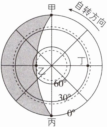 (1)地球自转的方向是自西向东,从北极上空看,呈逆时针方向,从南极上空看,呈顺时针方向,该题给出的地球自转示意图为逆时针方向,是从北极上空俯视地球自转的景象,并且图中即将迎来黎明的点是丙点,也就是位于晨线上的点。