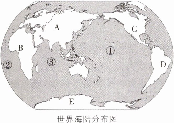 (4)纬度最高的大洲是 E____洲,面积最大的大洋是①____洋。