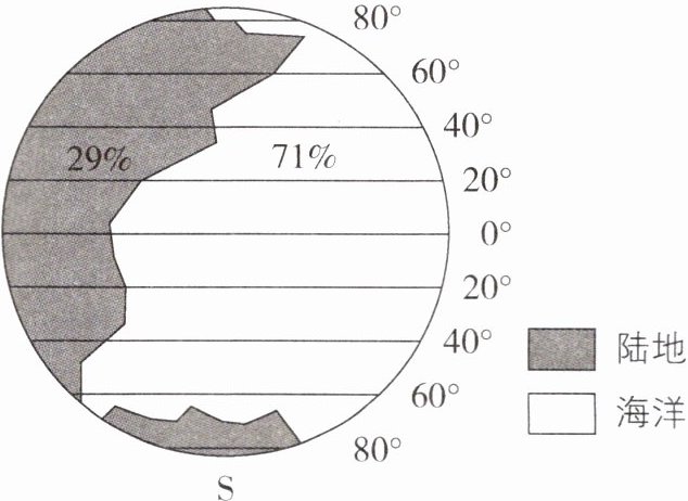 7.D 【解析】北半球陆地面积小于海洋面积,A不正确;南、北半球都是陆地面积小于海洋面积,B不正确;南半球陆地面积小于海洋面积,C不正确;南、北半球都是海洋面积大于陆地面积,D正确。故选D。8.C 【解析】地球表面有连续而广阔的海洋,陆地是被海洋隔开的,A不正确;陆地主要分布在北半球,B不正确;地球表面71%是海洋,而陆地面积仅占29%,七分是海洋,三分是陆地,海洋与陆地的面积比大致为7∶3,C正确;南极附近以陆地为主,北极附近以海洋为主,D不正确。故选C。