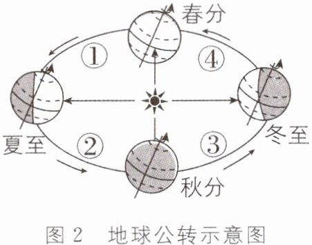 (2)2022年11月29日,正处于北半球秋分(9月23日前后)和北半球冬至(12月22日前后)之间,地球位于图2中①—④四个时段中的③时段。地球公转产生了四季的变化,随着地球的公转,神舟十五号返回舱成功着陆时,通辽市已处于夏季。