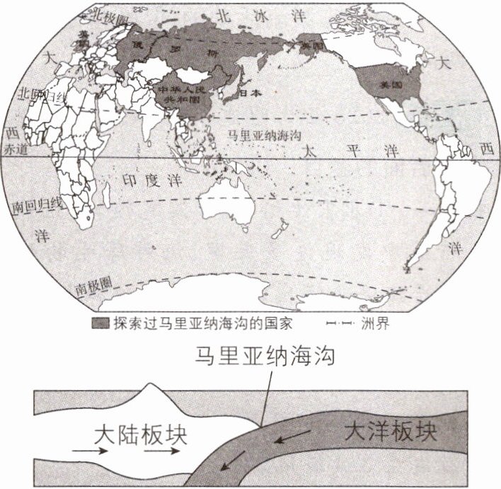 [2025 山西吕梁期中]奋斗者号在马里亚纳海沟成功坐底,坐底深度为 10 909 米,刷新中国载人深潜的新纪录。下图探索过马里亚纳海沟的国家分布示意图及马里亚纳海沟形成示意图。读图,完成 18~20 题。