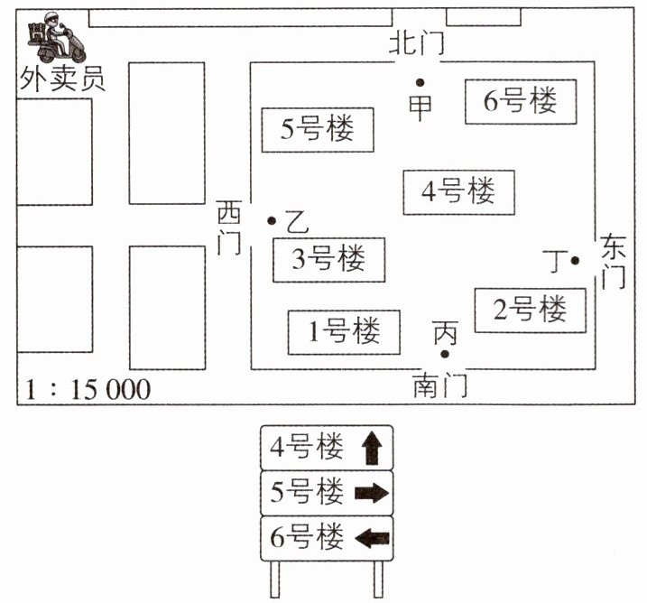 [2025江苏淮南期中]点外卖是现代年轻人的一种重要生活方式。下图为某小区及周边地区平面示意图(上图)和小区楼号指示牌(下图)。读图,完成1~2题。