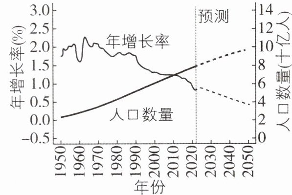 2 [2024 河南新乡期末] 2022 年 11 月 15 日,世界人口总数达到 80 亿人,这对人类发展而言既是压力也是成就。下图是世界人口数量和年增长率变化及预测图,根据图可知世界人口数量变化总趋势是( )