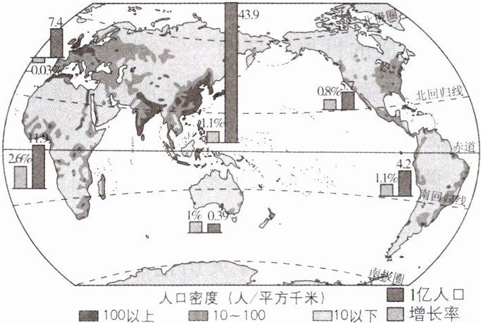 3.A 【解析】世界上人口分布不均,亚洲东部和南部、欧洲西部和南、北美洲东部等中低纬度沿海平原是人口稠密区。故选A。