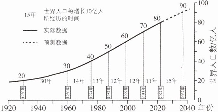 C 【解析】1987年,世界人口达到50亿人,A错误;1974—2022年,每增长10亿人用时不都相同,B错误;世界人口整体呈现增长趋势,C正确;从80亿人到90亿人,预计需要15年的时间,D错误。故选C。