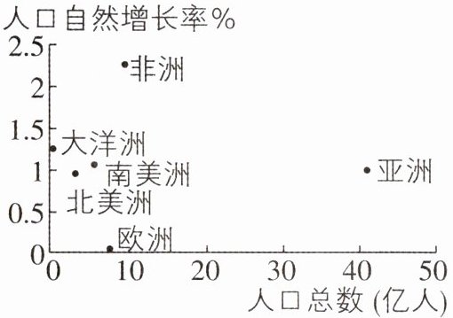 [2024 湖南衡阳期末,中] 下图为六个大洲人口总数及其人口自然增长率散点图。读图,回答 1~2 题。