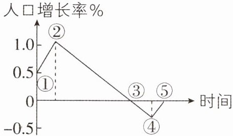 3.A 【解析】图中纵坐标表示人口增长率,人口增长率大于0的时候,人口总数在增加,人口增长率小于0的时候,人口总数在减少。①—②和②—③时间段人口增长率大于0,人口总数在增加,A正确;③—④和④—⑤时间段人口增长率小于0,人口总数在减少,B、C、D错误。故选A。