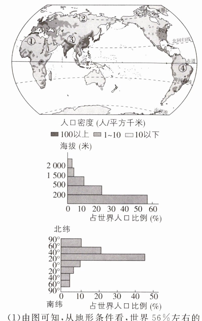 (1)由图可知,从地形条件看,世界56%左右的人口分布在海拔200米以下的____(填地形类型)地区;从半球和纬度位置看,世界人口主要分布在北半球的____(填“中低”或“中高”)纬度;从距海远近看,人口大多分布在____地区;由此综合考虑,我们可以推测,人口的分布与____因素密切相关。