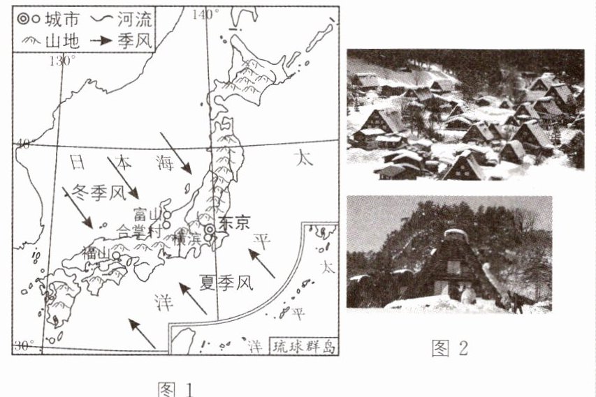[2025宁夏银川期末]日本本州岛的合掌村四面环山,水库水渠众多。合掌村独特的传统民居“合掌造”,完全是用自然生长的树木搭建而成,屋顶以厚厚的稻草和茅草覆盖,屋顶斜面夹角为50°~60°。图1为日本示意图,图2为合掌村聚落及“合掌造”景观图。读图,完成1~3题。