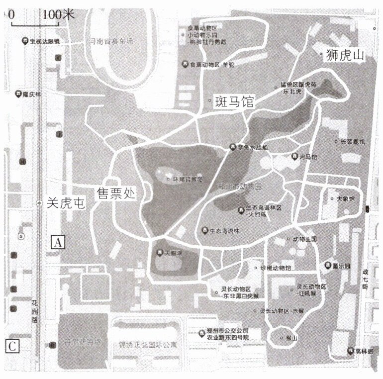 (5)图中比例尺表示图上1厘米代表实地距离100米,斑马馆到狮虎山的图上距离约为5厘米,实际上小华至少需要走500米。