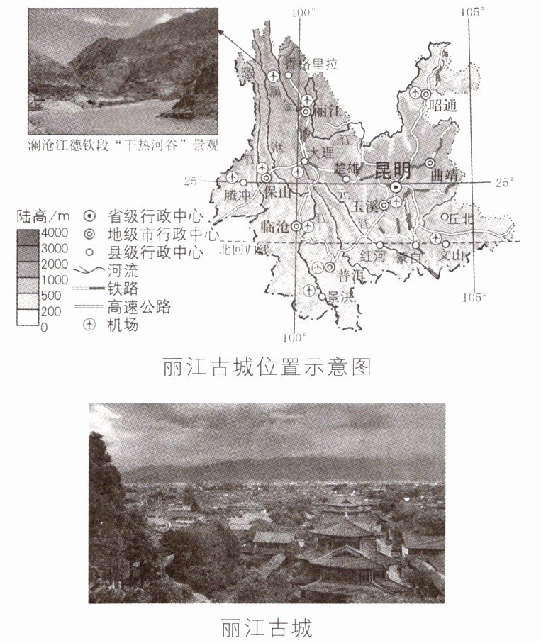 (2)丽江古城位于27°N附近,属于低纬度地区,冬季温暖;海拔2400米,海拔较高,夏季凉爽;临近江河,水资源丰富等(4分,任答两点言之有理即可)。