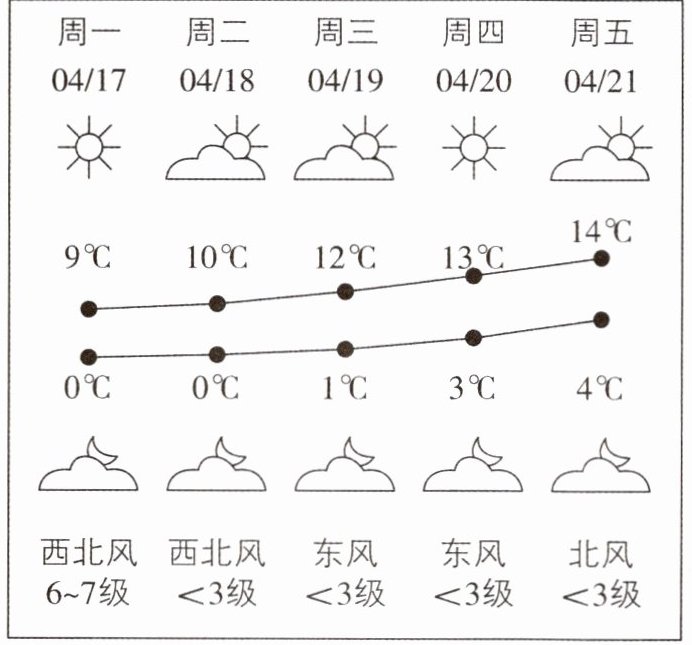 1 [2024陕西西安调研,中]新疆乌鲁木齐的智能光伏“太阳花”采用花瓣式结构,可以实现旋转折叠或展开的动作,日出“开花”,日落闭合,遇到大风和下雨等恶劣天气时,“花瓣”会自动折叠。读光伏“太阳花”示意图和乌鲁木齐五日天气预报图,根据天气预报图,“太阳花”发电效率最高的是( )