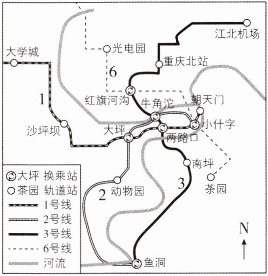 4.B 【解析】牛角沱站位于 2 号线和 3 号线的交会点,可以实现换乘,B 正确;朝天门站、沙坪坝站、光电园站都没有两条或以上的线路经过,不能实现换乘。故选 B。5.B 【解析】从大学城到江北机场,最佳线路是从 1 号线大学城出发经沙坪坝、大坪站→两路口站换乘 3 号线,换乘次数最少,路程较近。故选 B。
