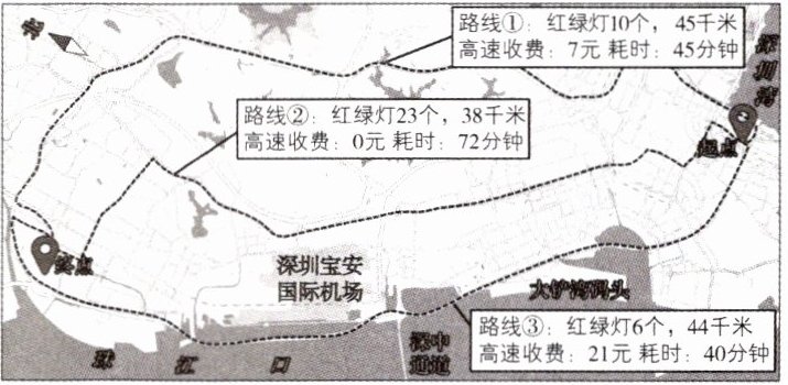[2024 广东深圳期末]家住南山区(起点)的小洲一家驾车前往宝安区的海上田园(终点)游玩,在电子地图上查询到三条路线方案,下图示意三条路线方案及其相关信息。据此完成 6~8 题。