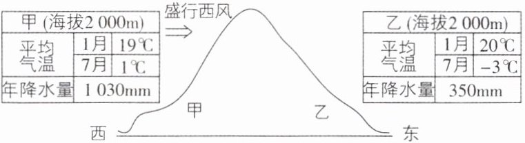 4.C 【解析】读图可知,该地的盛行风向为西风。乙地主要位于西风的背风坡,降水少;甲地位于西风的迎风坡,降水多。造成甲、乙两地降水差异的主要因素是地形地势。故选 C。