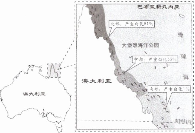 5 新考法[2025山东烟台期末]珊瑚礁是海洋最重要的生态系统之一,无数海洋生物聚集于此繁衍生息。澳大利亚的大堡礁是一串长约2300千米的珊瑚礁。目前,受全球变暖的影响,珊瑚礁出现了白化现象。下图为澳大利亚部分大堡礁严重白化度分布图。下列人类活动有助于减缓全球变暖趋势、延缓大堡礁珊瑚白化速度的是 ( )