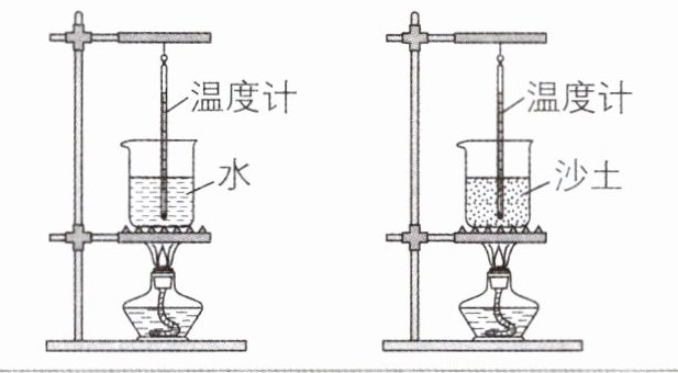 [2025河北廊坊期末]地理老师在课堂上设计了一个实验:同时加热烧杯中相同质量的水和沙土,观察二者升温速度的差异,并将实验结果记录下来(下图所示)。读图,完成1~2题。