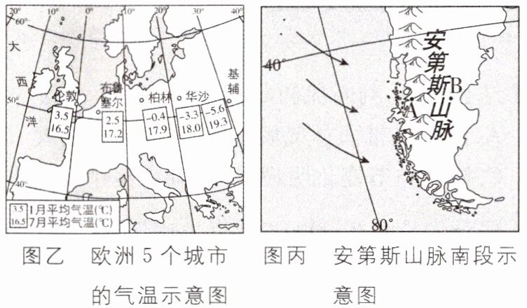 (2)图乙中自西向东的五个城市,距海越来越远,气候的大陆性逐渐增强,气温年较差逐渐增大。