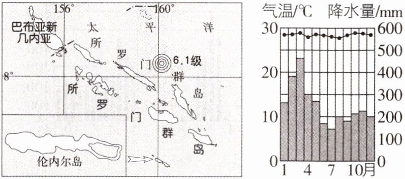 新考向 教材外区域综合设题[2024山东德州质检,中]近年来,由于气候变化,所罗门群岛周边海平面上升,已有多座岛屿被彻底淹没。下图为所罗门群岛位置示意图及该地气候资料图,完成3~4题。