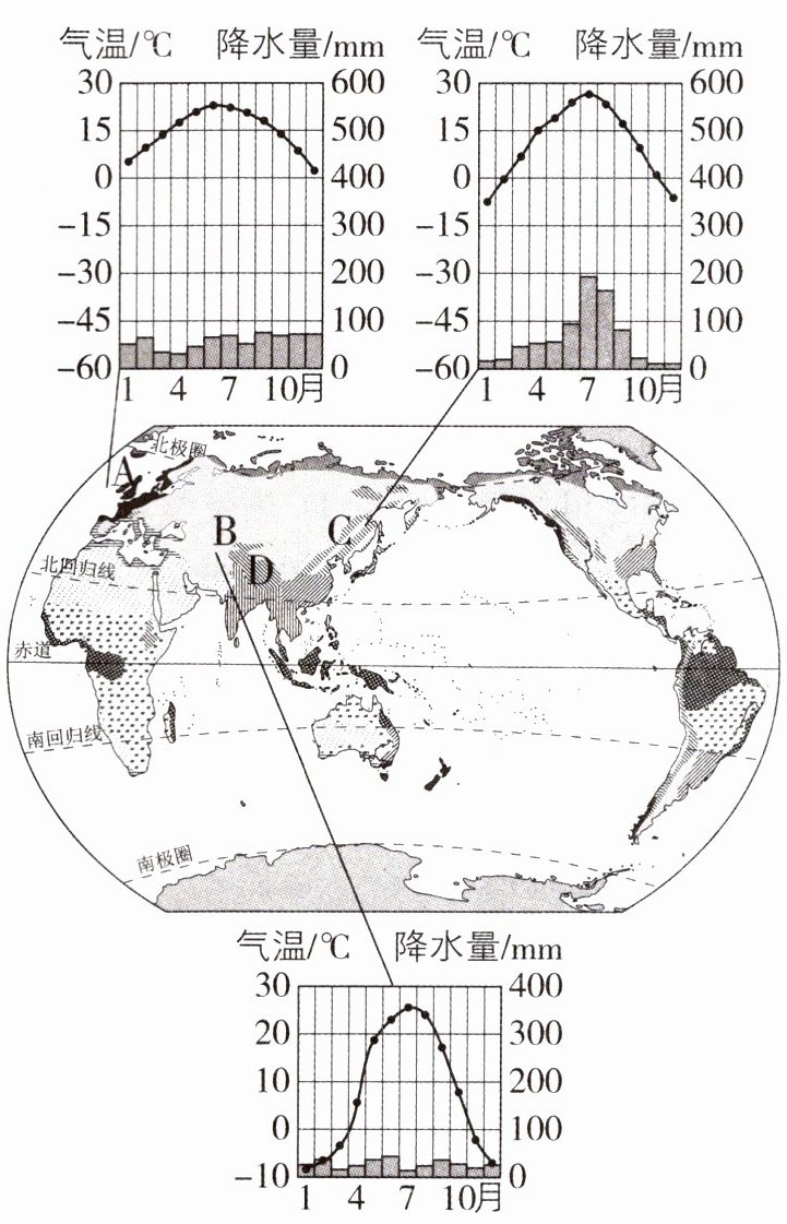 (2)由图可知,A、B、C 三地中,B 地全年降水最少。由于 B 地位于温带的内陆地区,远离海洋,气候干燥,全年降水少,其影响因素为海陆位置。