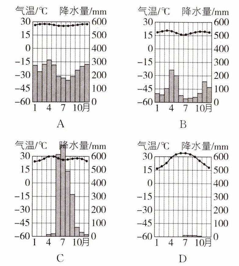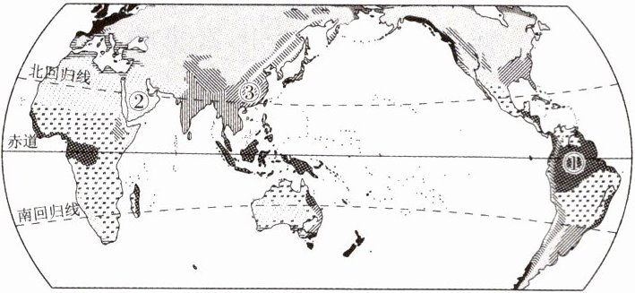 1. A 【解析】①地气候为热带雨林气候,其气候特征是全年高温多雨。A 地全年高温多雨,为热带雨林气候,A 正确;B 地全年高温,分干湿两季,为热带草原气候,B 不正确;C 地全年高温,分旱雨两季,为热带季风气候,C 不正确;D 地终年炎热干燥,为热带沙漠气候,D 不正确。