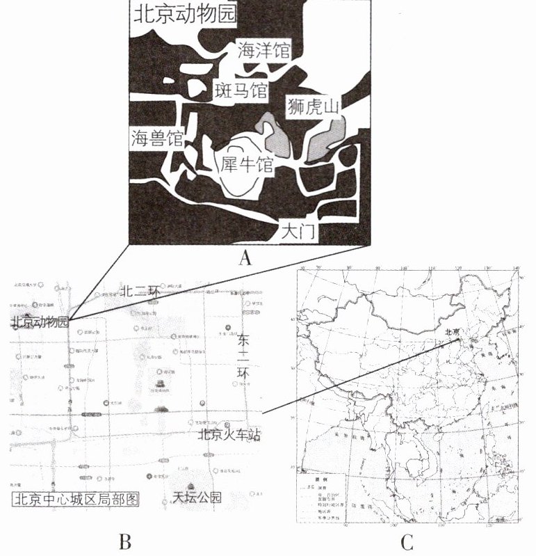 (2)图幅相同,范围越小,比例尺越大;范围越大,比例尺越小。三张不同区域的地图中,范围最大的是 C 中国地图,比例尺最小;范围最小的是 A 北京动物园图,比例尺最大。