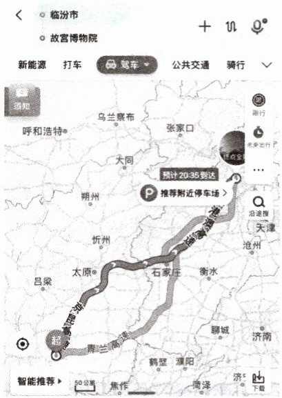 资料二 山西的小李想自驾去参观北京故宫博物院。下面是他利用地图软件查找的出行路线。